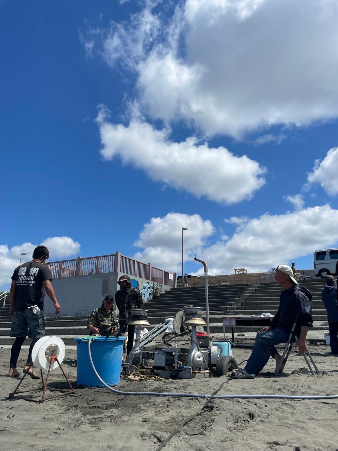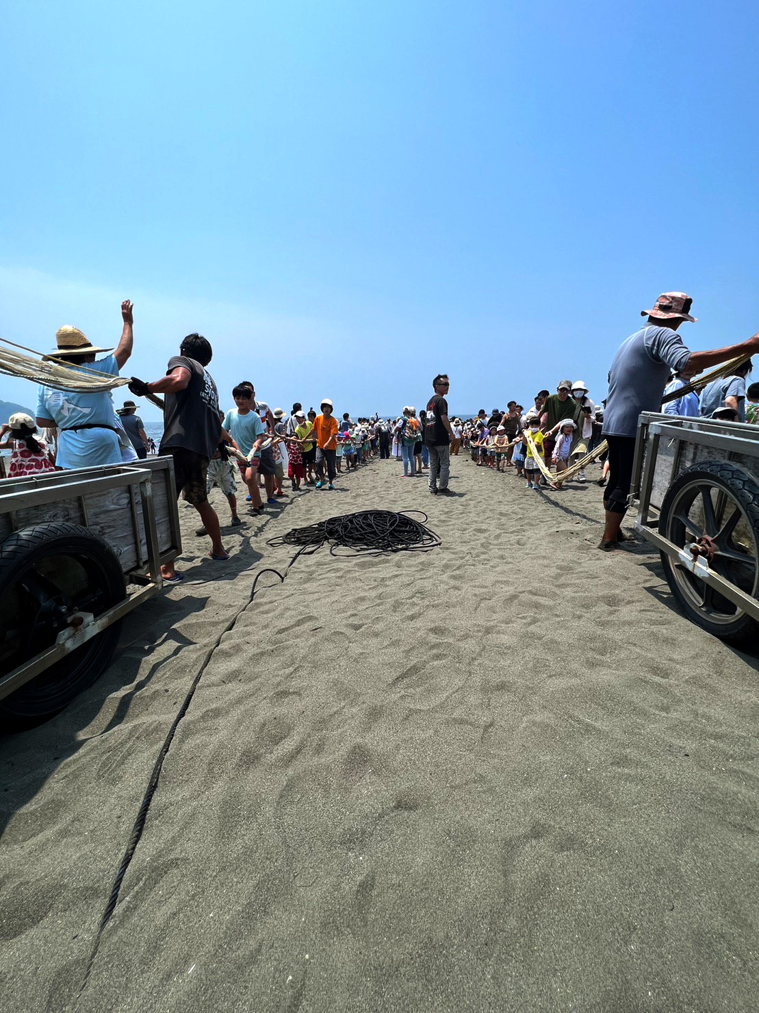- ③再び波打ち際まで戻り、ロープを持ってリヤカーまで引っ張るの繰り返しです。